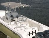 The 265 is laid out in a conventional center console design, with raised, wraparound seating in the bow. These seats contain two storage boxes, and the cushions provide comfortable seating. There’s a low-profile bow rail and a stainless-steel bow roller with offset cleats. The anchor locker is also offset in the deck, slightly to port.