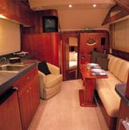 The newest Luhrs convertible is also deceptive when it comes to creature comforts-you typically won’t find this much luxury in boats of its size. The salon is accented with teak interior, recessed Halogen lighting and designer fabrics. A sofa, barrel chair and high-low dining table allow onboard entertaining, with music provided by the built-in AM/FM stereo with CD player. Or, get some quick work done using the convenient electrical panel countertop to park the laptop computer. Stash the everyday fishing rods in the handy overhead racks and store the backup arsenal in the supplemental racks inside the sofa.