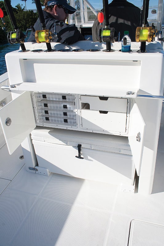 Tuck the cooler away, and the same area becomes a tackle prep station with a rigging table that folds out over a cabinet with trays and drawers. Above, angled stowage hold five rods and four drink holders.