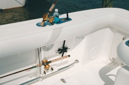 ||| |—|—| |SPECIFICATIONS| |LOA|24′ 9″| |Beam|8′ 6″| |Draft|1′ 3″| |Dry weight|3,500 lbs.| |Deadrise|20 ¿ree;| |Fuel|122 gals.| |Water|12 gals.| |Base price|$65,803| |w/ 225-hp Mercury OptiMax outboard| The roomy cockpit includes two 100-quart insulated boxes in the deck that can be used as fishboxes or storage compartments. Two more insulated cooler compartments are just aft of the helm pedestal seats and come with cushioned lids to double as observer seats when trolling. Rod racks are standard under the gunwales, along with molded downrigger-weight cradles. Stainless-steel rod holders in the transom and gunwales are also standard. The stainless-steel hawse pipes feature integrated cup holders that keep a beverage from spilling when the adjacent rod goes off. The transom bench seat folds down and out of the way when the action turns on.