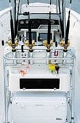 Under-gunwale rod racks on both sides of the cockpit hold up to six rods each, including fly rods to nine feet. Entire conventional rod-and-reel outfits can be concealed behind lockable, hinged covers for security. Four flush-mount rod holders, two on each side in the covering boards, are standard. The optional T-top on our test boat provided an overhead storage net for beach gear or PFDs, and had four additional rod racks.