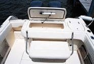 Lots of builders have wrestled with the transom-seat dilemma: How do you make it convenient when running, yet out of the way once the fishing begins? Grady seems to have worked out an especially slick and efficient system that answers the challenge. An ingenious mechanical arrangement allows the seat to fold flush against the transom, beneath the cockpit bolster, where it’s out of the way until needed. The same hinge mechanism allows the seat to be lifted up onto the fishbox to provide access to the bilge via the hatch in the lower section of the transom. It’s an arrangement that really works.