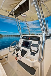 Forward of the console, with removable seat cushions, is a fully integrated 72-quart cooler that can be upgraded to a superinsulated cooler for heavy-duty cold storage. The console on the 230 features a stand-up head compartment with a vinyl liner, as opposed to cloth, so cleaning and maintenance is much easier. The console also houses the batteries, where they stay dry and out of the bilge for better access and longer life. The helm area of the 230 console is well laid out and has plenty of room for flush-mount electronics, with the gauge and switch panel above, more at eye level, so you do not have to look down to monitor engine functions. A side-mounted helm sits to port, with the binnacle on the centerline and dual drink holders to starboard.
