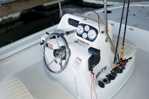 The console is well thought out, with good access and room for three batteries underneath: one to handle cranking the engine, one to run the livewell and bubbler system, as well as any electronics, and one as a trolling-motor battery when that option is selected. There are three vertical rod holders on each side of the console for quick access and easy storage while fishing, and the cushioned forward console seat houses an 18-gallon aerated livewell. The business side of the console has a panel for flush-mounting electronics, a side-mount binnacle control to save dash space, and a gauge cluster that’s easily read in front of the helm. A wraparound windscreen and handrail fit the console and boat nicely. The console seat is a 72-quart cushioned cooler with a flip-flop backrest, so you can sit facing aft when drifting and lean back.