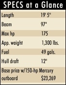 Trophy also increased the depth of the cockpit to make the 1903 safer. The boat comes with a swim platform builtinto the engine platform, a vertical surface in the molded-fiberglassconsole where it’s easy to flush-mount electronics, a windshieldwith a welded, stainless-steel handrail, and a standard Escortgalvanized trailer. The 1903 is also covered by a transferableten-year limited structural hull warranty. Trophy Boats, Everett,WA; (800) 544-6220; www.trophyfishing.com.|