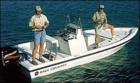 The new 2000 Bay from Back Country Powerboats featuresfull foam flotation, a self-bailing cockpit and lots of standardstorage compartments and foam-insulated wells. It also offerstwo lockable rod boxes and 750 gph live well pumps. The boat ispre-wired for a bow-mounted trolling motor and comes with a standard28-gallon live well. Back Country even throws in a Float-On aluminumtrailer as standard equipment.
