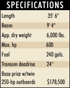 The 360 has a relatively narrow 9′ 4″ beam and is quite fast. Our test boat featured twin 250-hp Evinrude Ficht outboards, and cruised easily at 34 mph at 4000 rpm. At full throttle, the 360 topped out at 54 mph, and acceleration and handling were excellent throughout the power band. The Palmetto’s well-balanced deep-vee hull rode soft and dry in the chop off Stuart, Florida, even when we drove it hard into the seas. It was an exemplary ride.