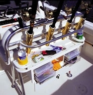 The rocket launcher/leaning post holds four rods and contains a tackle-storage bin, along with two handy drink holders. An aluminum foot rail along the aft edge of the console makes steering more comfortable-a Pursuit hallmark. The designers at Pursuit spend a lot of time thinking about ergonomics, and it shows in the details.