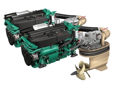 Responding to the growing demand for IPS drives, Volvo Penta has now matched its Inboard Performance System to the new, 700 hp 11-liter engine with the IPS 900 system. The in-line six-cylinder engine connects to the forward-facing “tractor” drives via jack shafts. With a dual-engine setup, it’s suitable for planing hulls up to 55 feet. A twin-entry turbocharger generates pulse charges. Those charges, combined with a mechanical compressor, produce torque at low rpm levels. The larger IPS drives and counter-rotating propellers give rapid acceleration, quicker response, increased fuel efficiency and range. Lower noise, vibration and exhaust fumes are also noticeable benefits of the IPS drives.