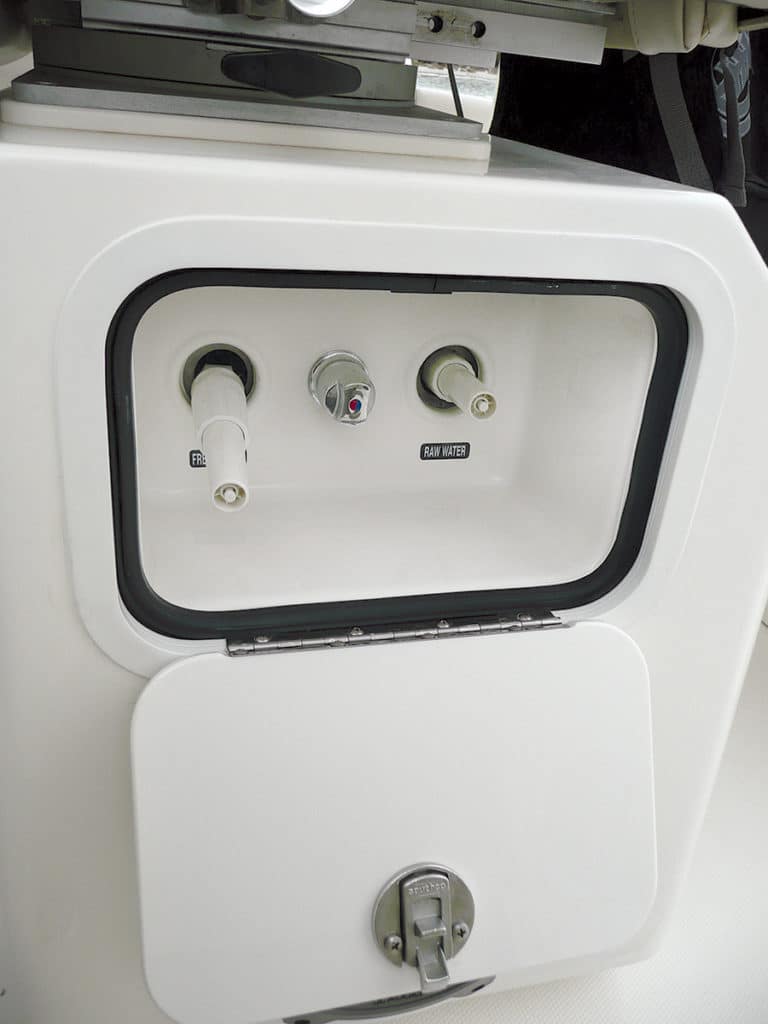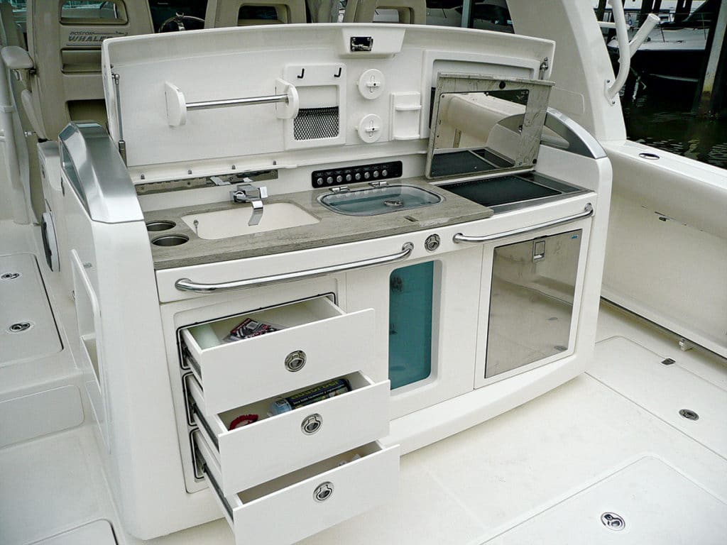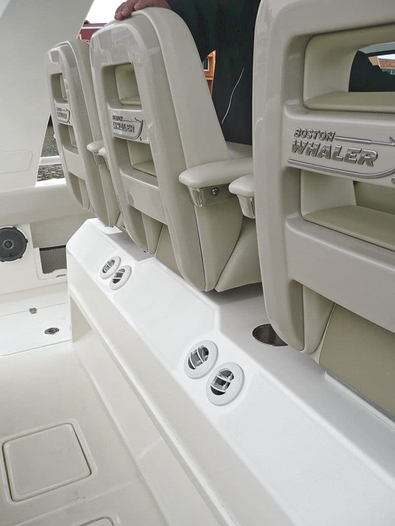 Everything about the 420 is inviting, evidenced by two access doors located aft — one on the port side for boarding or boating large fish, the other on the transom, to starboard, to allow access for swimmers with the removable ladder. Next to catch my eye was the center console, with two rows of seating and air-conditioning vents serving both. The front row consists of three bolster-style seats with fold-down armrests. The center seat actuates electronically; the others rotate to face the rear. The second row, a leaning post that converts to a three-person bench, houses three tackle drawers, a 40-gallon pressurized aquarium-style livewell, and a bait-rigging station with sink that can be replaced with an optional summer kitchen with fridge and electric grill.
