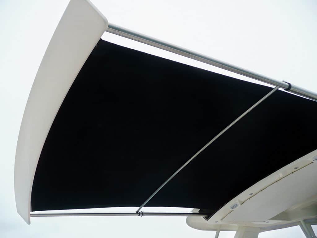 A hardtop holds a lockable electronics box. Ladders built into the frame keep walkways unobstructed while providing access to the optional flybridge and a second control station. An optional canopy deploys rearward, the length of the cockpit, for instant shade at the touch of a button.