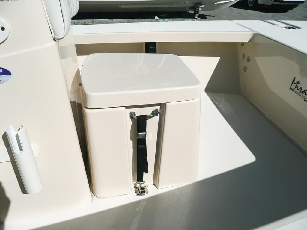 The new Mirage dons a taller console to house sizable electronics. It has a fold-down hatch that also slides out for easier access to batteries and wiring inside. Vertical rod racks and a removable cooler that doubles as a seat and matches the console in width and design are available options. Twin in-deck compartments provide ample aft storage and bookend a 30-gallon livewell with dual in-flow system (water comes in at the top and bottom), an 800 gph pump and through-hull high-speed pickup.