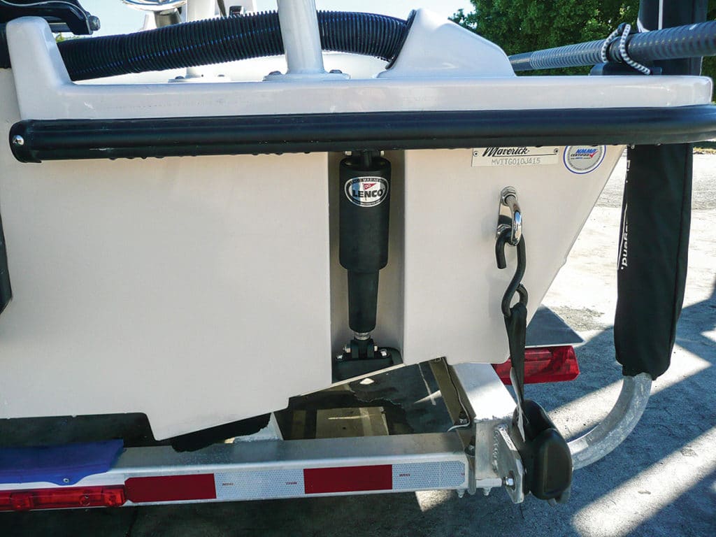 Next, I trimmed the outboard a couple of clicks, brought the tabs almost all the way up and throttled down to 4,200 rpm. The 18 HPX-V responded by settling into a comfortable cruising speed of 37 mph that let us take on the chop without squeezing the steering wheel or grab bars to brace ourselves. Pushing the rpm to 5,000, the Maverick accelerated instantly to 44 mph and remained perfectly under control despite the bumpy water.