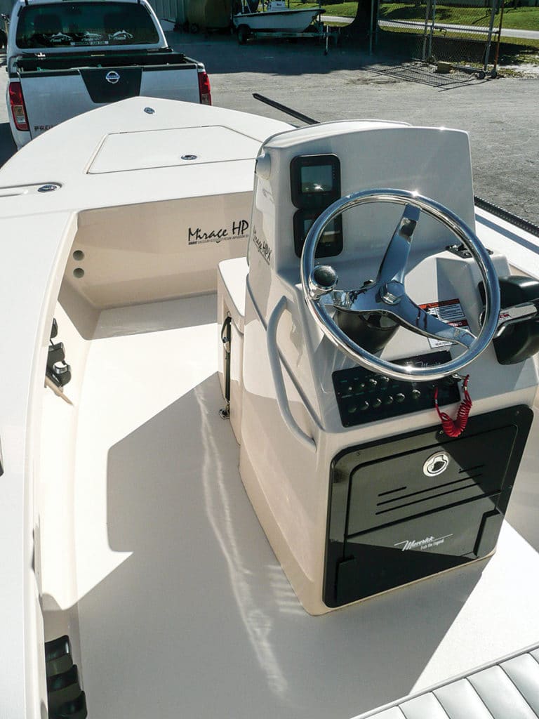 The test Mirage was rigged with a Yamaha F115LB, an excellent match. It provided more than adequate power and proved light enough to float easily in tailing-fish depth. The 18 HPX-V jumped on plane in a mere three seconds, or roughly two-boat lengths — a big plus when the tide gets pretty low and a nearby sand hole is your only runway to jump up and get out of Dodge.