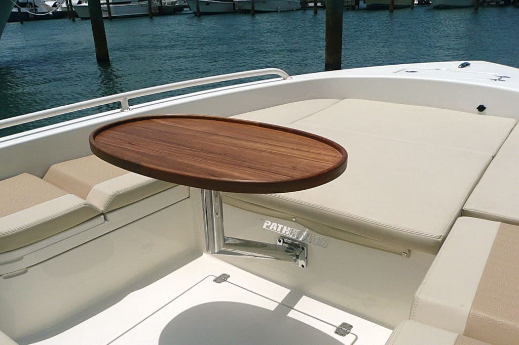 The Pathfinder comes equipped with a hydraulic jack plate, so neither cruising over shallow areas nor getting on plane when the tide drops are major concerns. Wiring for a 36-volt trolling motor on the bow is also standard.