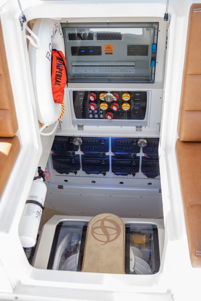 Freshwater and raw-water washdown hoses pull out from ports in the aft hardtop supports. A transom door in the starboard quarter provides access to the full-width platform. A wide dive door on the port side includes a 6-foot by 2-foot, dive platform that cantilevers outward on hydraulics. The middle aft-facing seat lifts upward to reveal an immaculate step-down systems compartment.