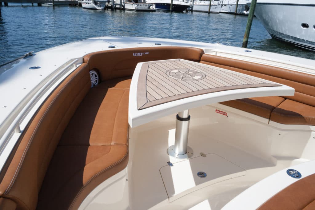 Topside, padded coaming bolsters encircle the interior, and 2-foot, 4-inch-wide walkways around the console make it easy to follow a hooked fish around the boat. An expansive lounger with angled backrests and fold-down armrests is ideal for crew to take a load off. In the bow, U-shaped seating surrounds a teak table with motorized pedestal that retracts to deck level.