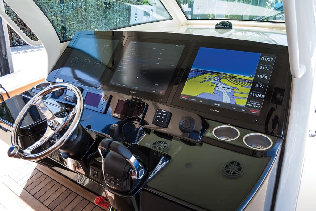 On the starboard side of the seating module, I found an Isotherm drawer-style fridge/freezer/ice maker and an electric grill. On the port side was a cavernous top-opening cooler. The top of the module serves as step up access topside should you opt for a tower and second helm. A pair of Rupp carbon fiber outriggers stands ready for action, and three-across seats on the bridge deck feature individual flip-up bolsters and armrests. Enveloped by a three-piece tempered-glass windshield and integrated hardtop, the 59-inch-wide helm accommodated three Garmin 19-inch multifunction displays to manage the chart plotter, Garmin 424 xHD 4-foot open-array radar, GSD 26 CHIRP sounder, autopilot, Fusion stereo, CZone digital switching and more. The helm also housed a pair of Yamaha Command Link Plus gauges and Helm Master system with joystick and Sidepower Proportional bow thruster that made extracting the 42-footer from its tight dock space a cinch.