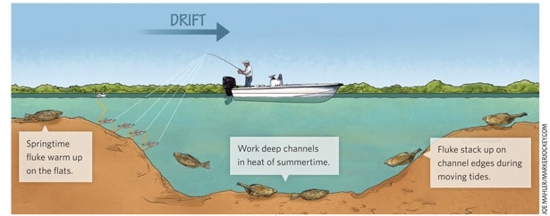 **In late June through September, when water temperatures begin to rise into the low to mid-70s, flatties begin to station themselves deeper in the channel bottoms and lower on the channel edges. Channels such as Oyster Creek and Double Creek in Barnegat Bay, Paddy’s Hole near Ludlam Bay, and Broad Creek in Absecon Bay dip dramatically from flats to six to 20 feet, and the rushing tides turn the channels into virtual food funnels as fluke hunker down to pounce on morsels of bait that wash by. Full-moon and new-moon tides put fluke on the feed big-time, as the rising currents create a buffet line by washing fiddler crabs, copepods, sea worms and fish fry off the tops of the sod banks. Back channels are baitfish superhighways, and fluke know it.