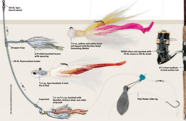 Lures: Bucktails from 14- to 34-ounce tipped with Fin-S Fish, Berkley Gulp! Jerk Shad or Swimming Mullet, or a strip bait of squid, bluefish or two whole spearing. Teasers tied above the bucktail should be white 2/0 to 3/0 bucktails with Mylar flash. Strip baits of bluefish, squid, spearing or sand eels on a fish-finder slide rig with a leader of 30-inch 25-pound fluorocarbon, on a size 2/0 Gamakatsu Octopus hook.
