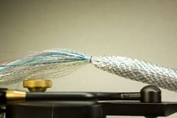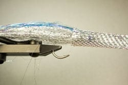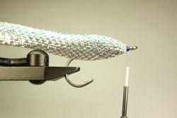 | | Step 3: Tie down a second layer of silver Polar Flash (each layer should be an equal amount) to the underside of the hook.|