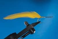 | | Step 2: Select four or six saddle hackles, approximately 3 to 4 inches in length. Remove any stray barbells at the quill end, making it possible to secure them flatly. Then pair them up facing each other and tie down.|