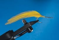 | | Step 5: Take two long, webby saddle hackles and strip the marabou from the quill end. Tie in and then palmer forward, again teasing after each wrap. Fold palmered hackles back, tie off, whip finish and apply head cement.|