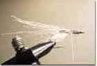 Step 5: Just behind the eye, tie in a few more strands of cocoa hair, followed by two or three strands of white Krystal Flash, topped with a’few strands of light olive-brown Bozo hair or equivalent. This treatment gives the color and sheen similar to that brassy glint on the fish�s back. To the side add a silver stripe with Flashabou and tie in the final piece of rabbit fur underneath.