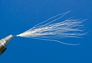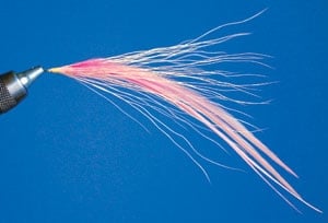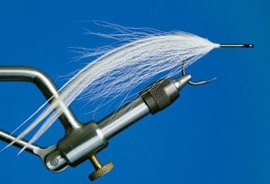 So off to my tying bench I lumbered during one of Evie’s short naps. (Whoever coined the phrase “sleeping like a baby” never met my daughter!) I rummaged through boxes of materials, gathering bucktail, long saddle patches and single- strand wire. I lashed a small clump of bucktail and a few thin saddle hackles to a short piece of wire. Then I repeated the process, creating several separate pieces. My goal was to bend the wired portions to the desired angle before attaching the wire to the hook shank. This technique allowed me to prop up the materials at much higher angles than could be achieved from traditional tying methods of securing the materials directly to the hook shank.
