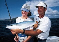 Captain Loren Nickbarg displays a rainbow runner caught by Chrystal Richardson off Congo Island.|